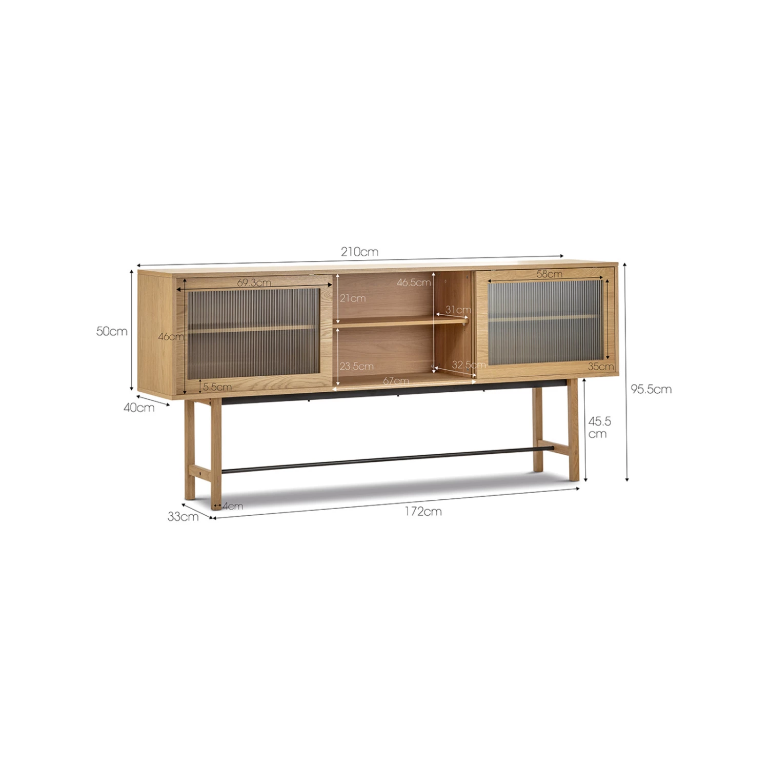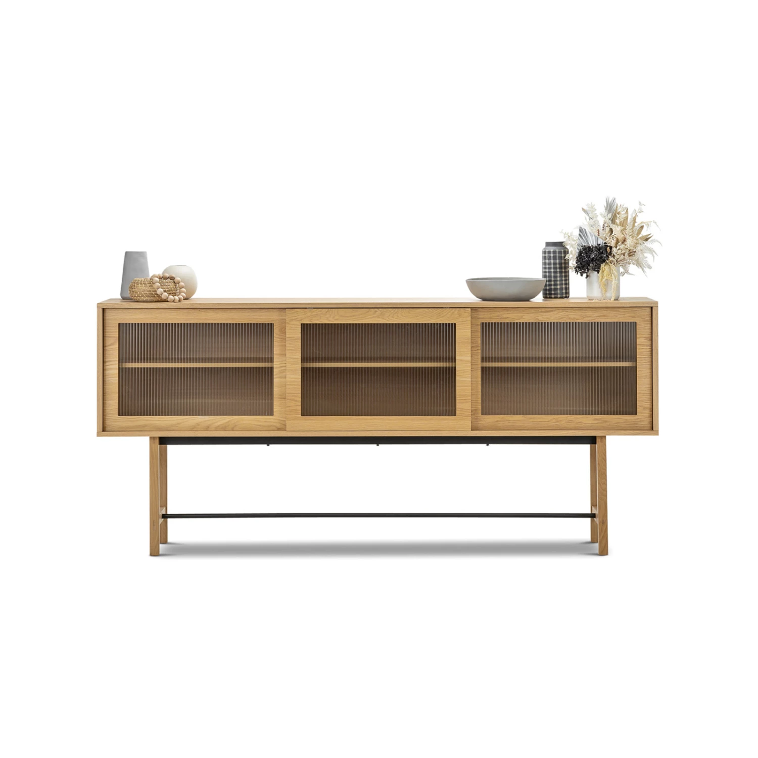Fluted Glass has been long popular amongst interior designers for the its textured appearance and the ability to diffuse light. Distinctively characterised by its vertical grooves and ribbed edges. The Arae Fluted Glass Sideboard is an adaptation to those principles. The spacious sideboard balances modular design with functional Scandi appeal. Incorporating elements of modern architecture, the fluted glass doors create a unique type of transparency, just enough to peak at one’s curiosity at what’s behind those doors. Combining American oak wood veneers and complementing clean-black stainless steel lines. The unit rests upon a slender set of legs. Suspending the sideboard at just the right level and reach. Who knew functionality and aesthetics could be paired so well together.