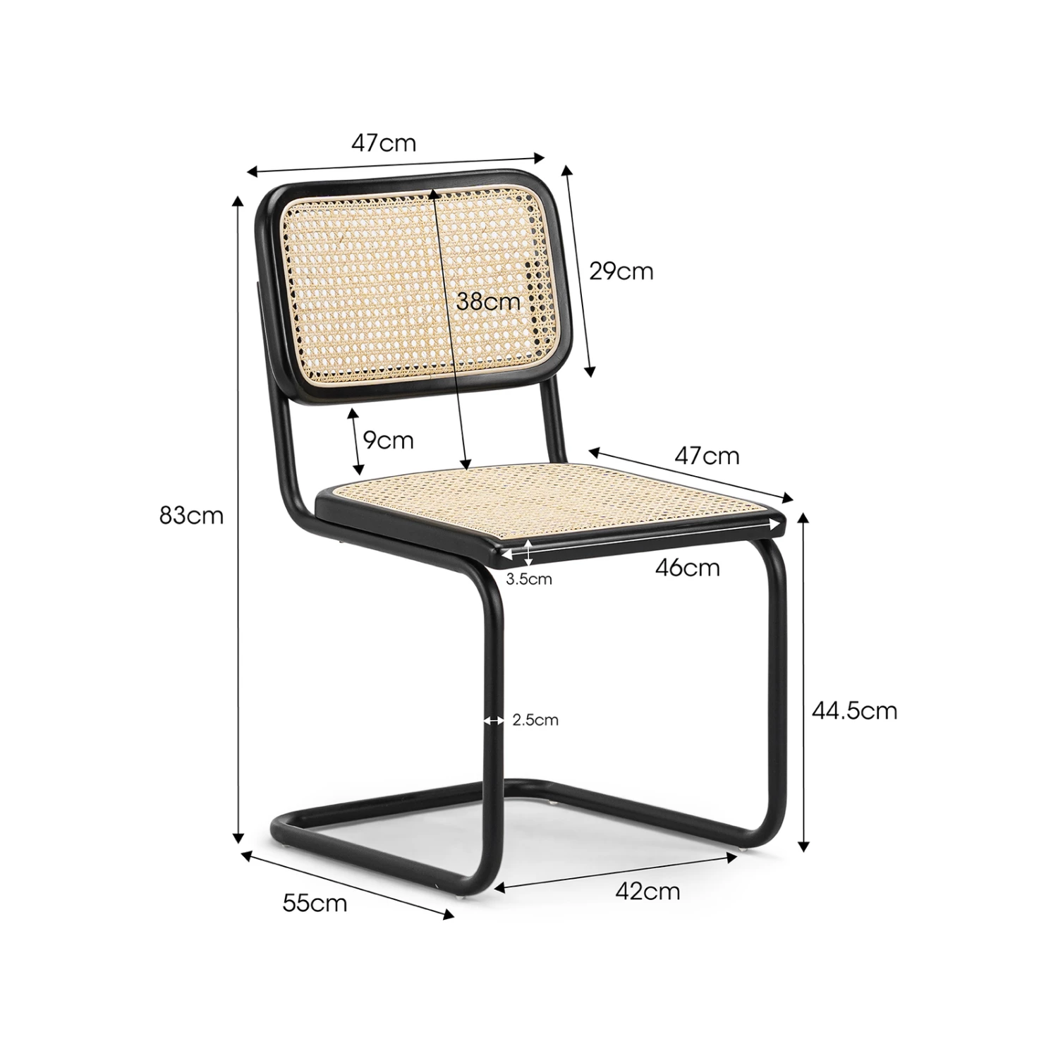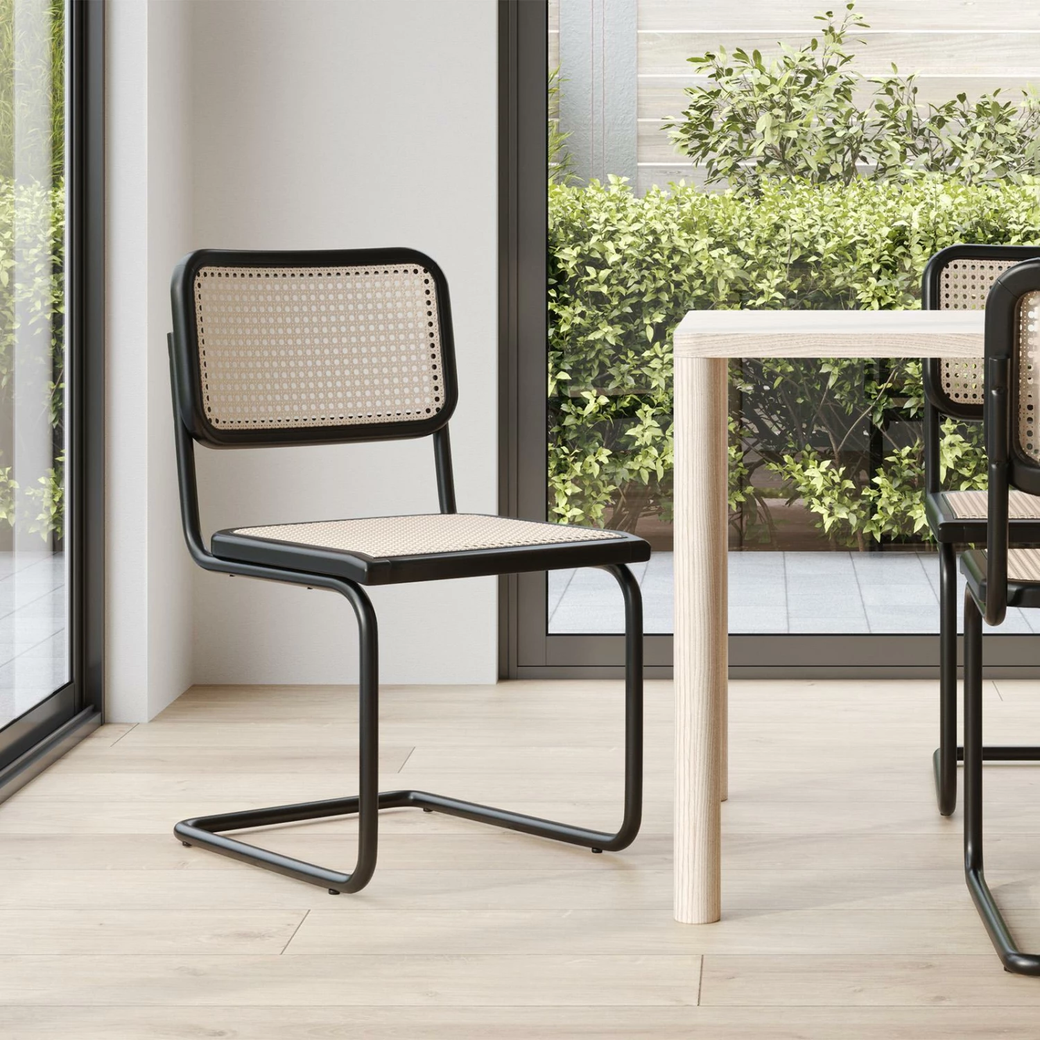 The Blaire Dining Chairs are our ode to the legendary classic 1928 Marcel Breuer Cane Cesca Chair, an iconic piece of furniture commissioned into mass production because of its artful form. This chair embodies a modern mid-century design that injects timelessness into any dining room space. The Blaire’s graceful stance owes to its cantilever form, appearing to float from a distance. A natural rattan wicker caning in its seat and backrest ensures the right balance of comfort and aesthetic.