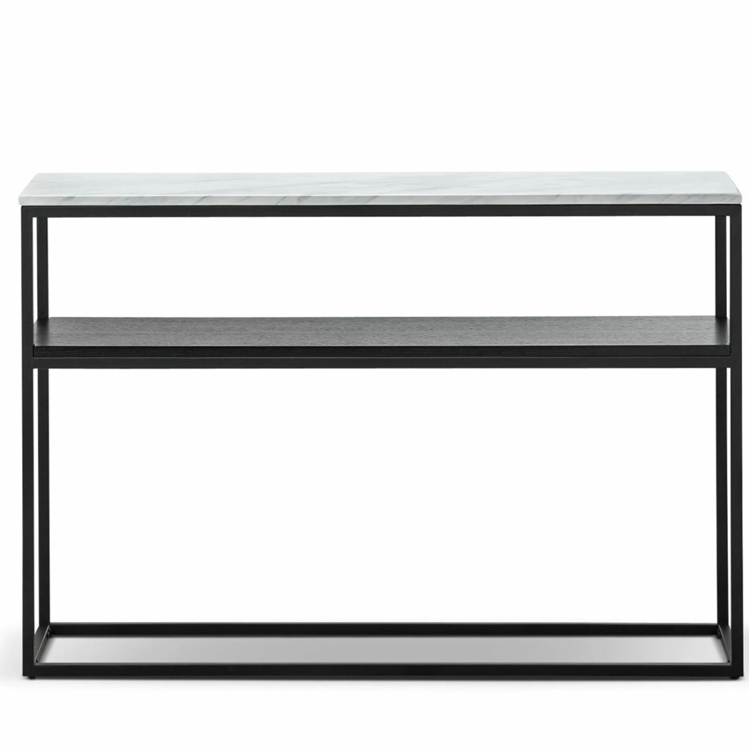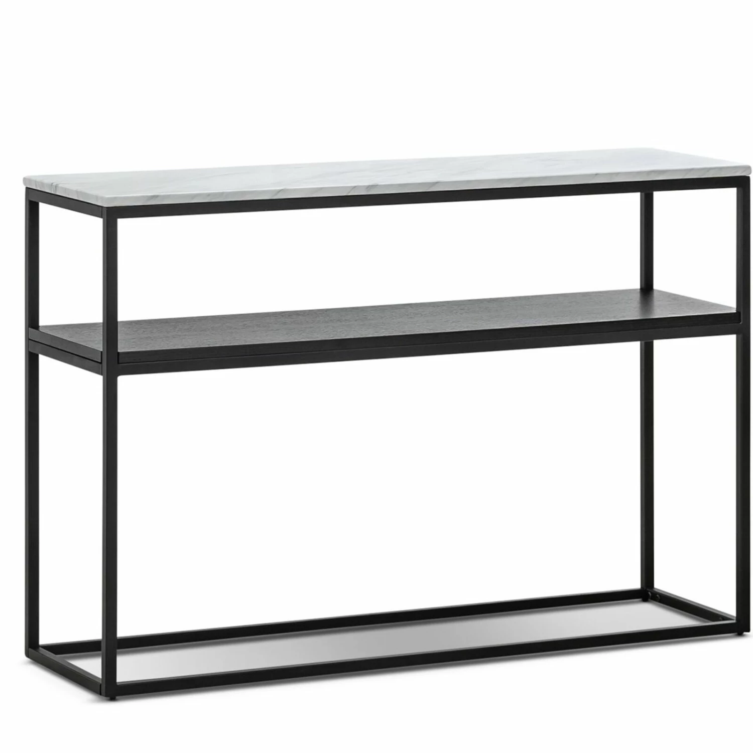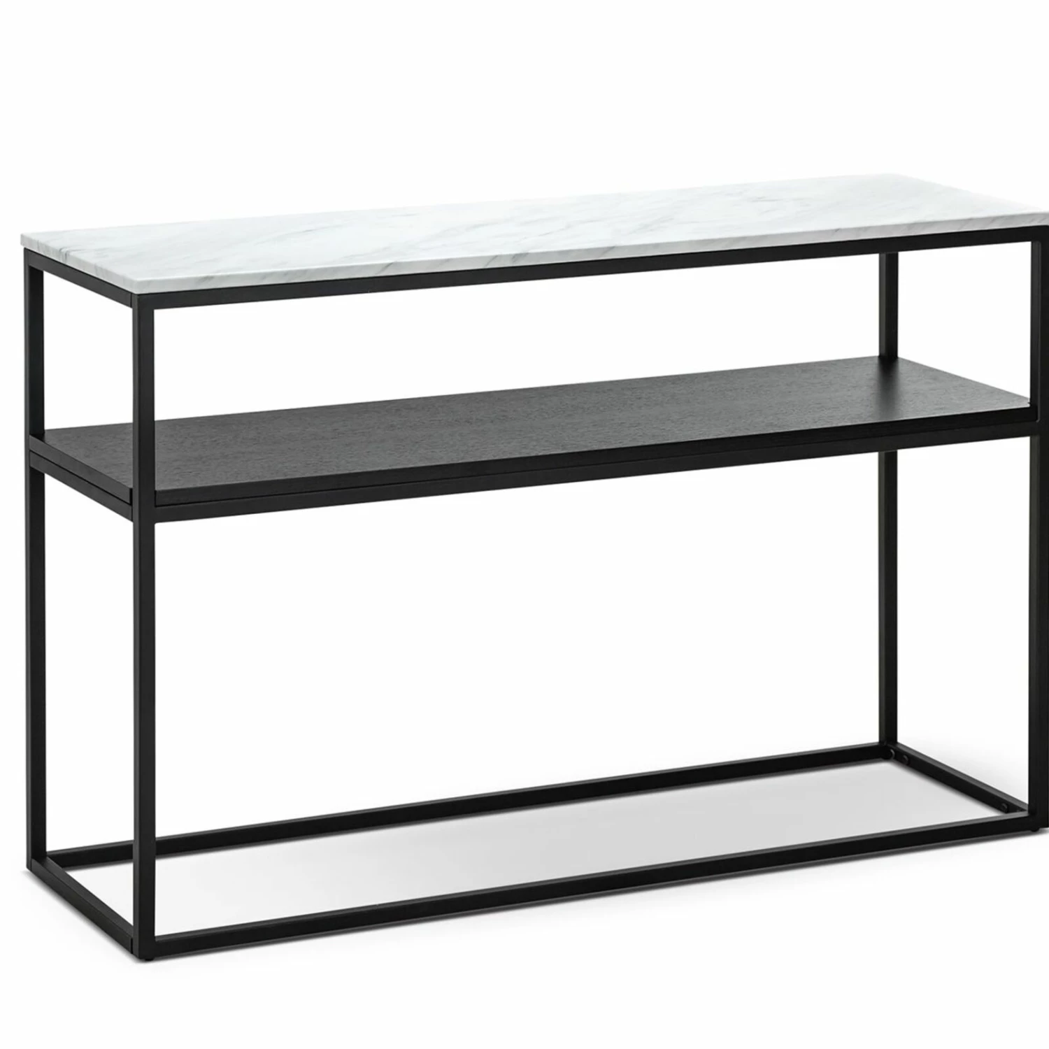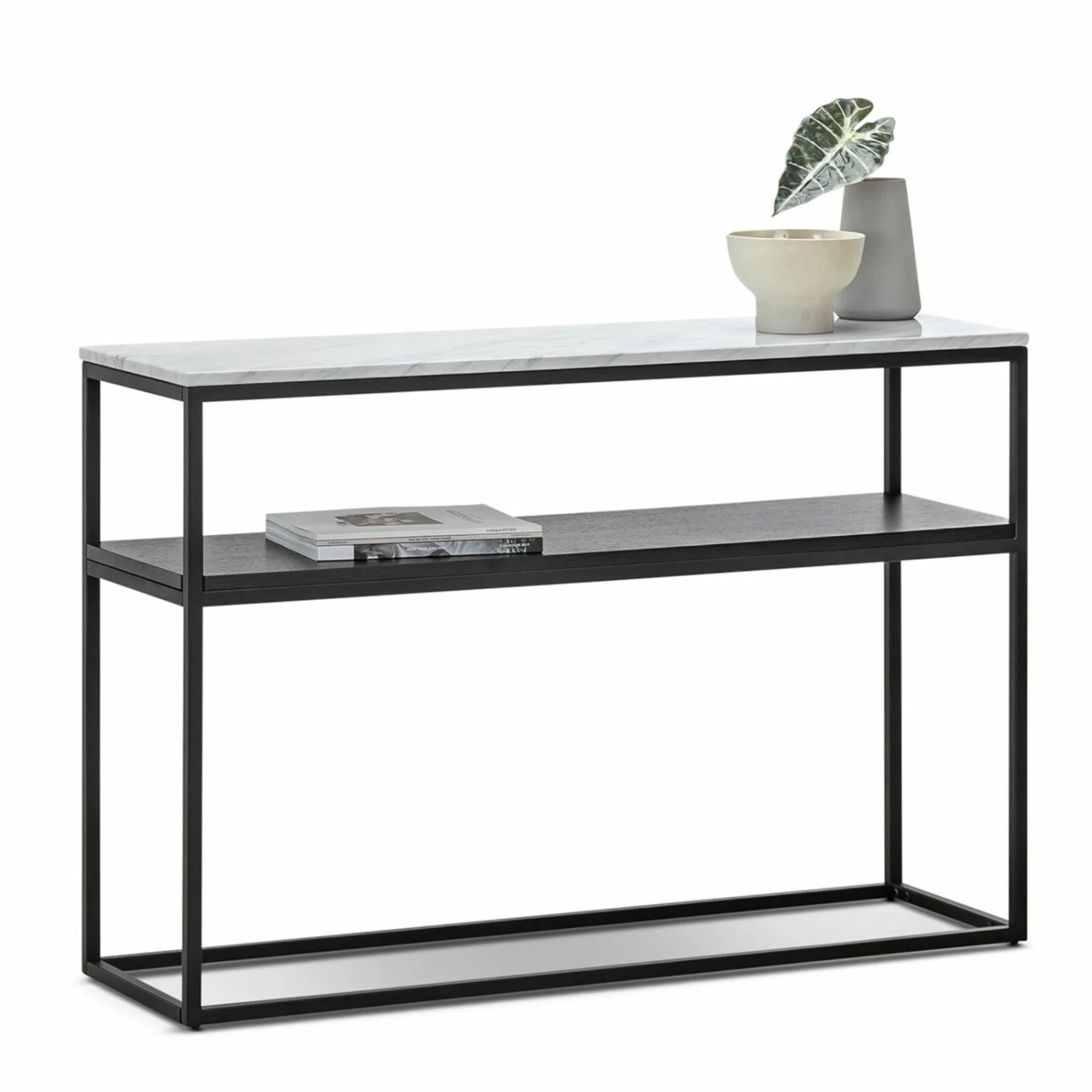 The Ebonie white marble console table is a flawless piece to complete any hallway or entrance. It presents an enigma of urban monochromatic styling with a white marble table top resting on matte black stainless steel frame and featuring a bold timber shelf for added functionality. Embodying an elegant open minimalist design for ones’ everyday needs. The Ebonie console effortlessly creates a benchmark of luxury and a lasting impression for anyone who sets foot through the front door.Additional Information: Marbles vary in types and appearances. The marble is white in colour with fine blue or grey feathery veining. The veining pattern is linear and soft in appearance. Due to organic nature, no two pieces will be the same. Light yellow stains may be present due to natural oxidization.