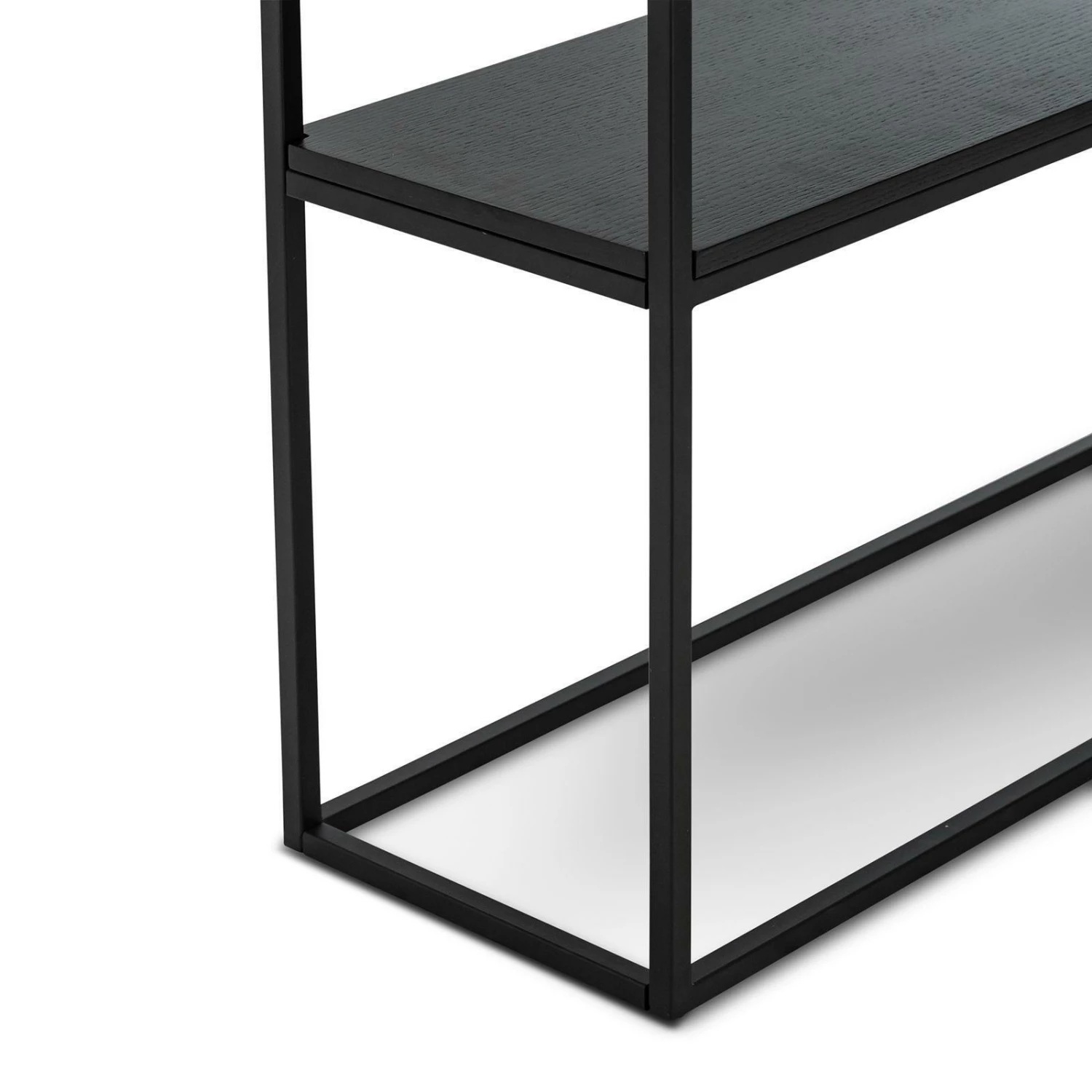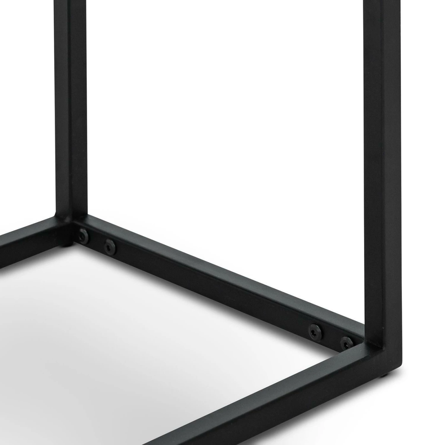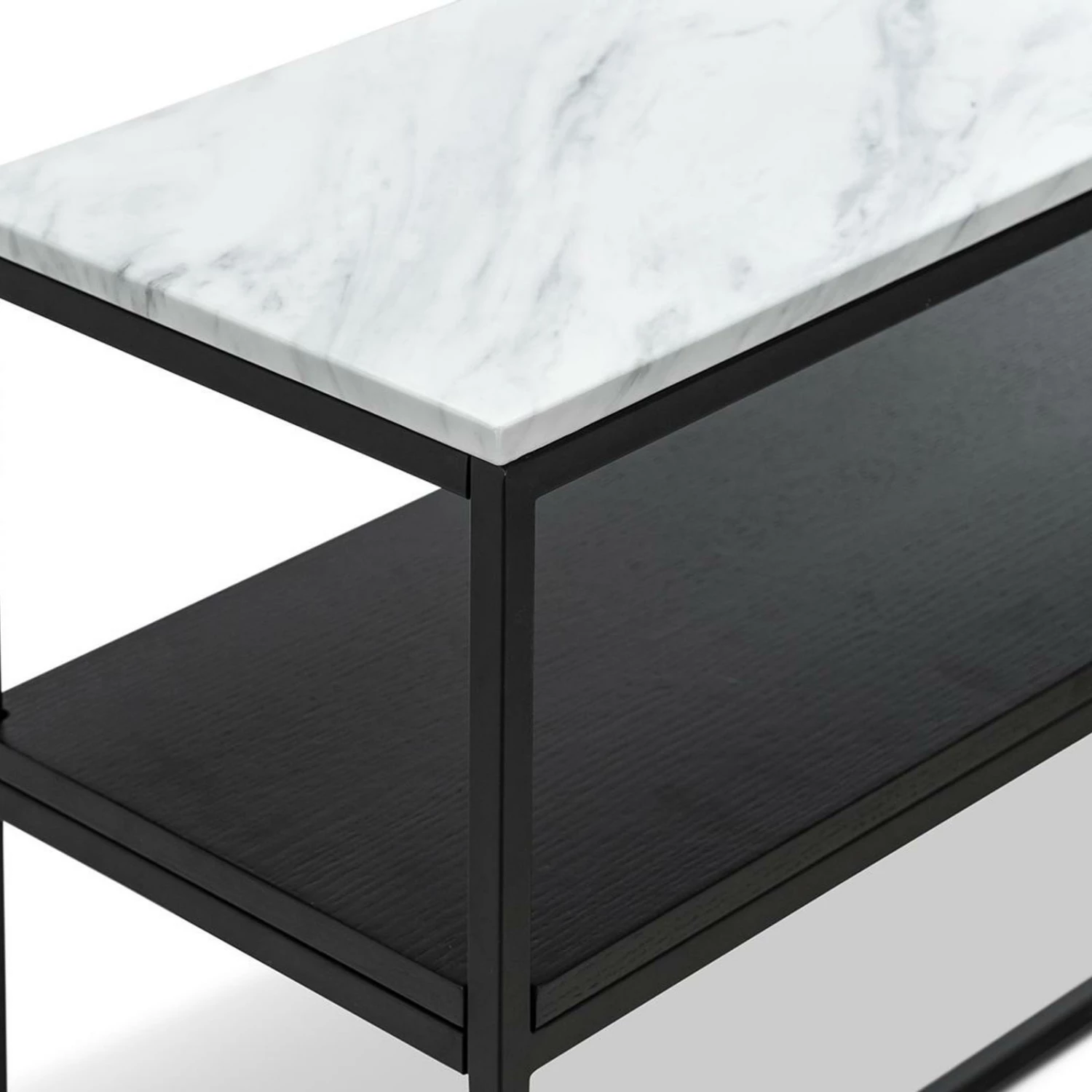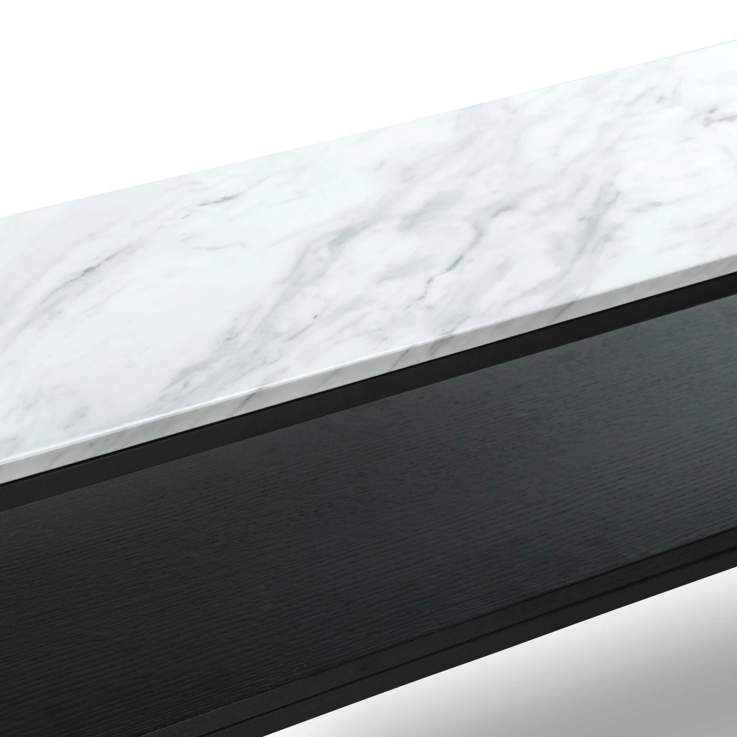 The Ebonie white marble console table is a flawless piece to complete any hallway or entrance. It presents an enigma of urban monochromatic styling with a white marble table top resting on matte black stainless steel frame and featuring a bold timber shelf for added functionality. Embodying an elegant open minimalist design for ones’ everyday needs. The Ebonie console effortlessly creates a benchmark of luxury and a lasting impression for anyone who sets foot through the front door.Additional Information: Marbles vary in types and appearances. The marble is white in colour with fine blue or grey feathery veining. The veining pattern is linear and soft in appearance. Due to organic nature, no two pieces will be the same. Light yellow stains may be present due to natural oxidization.