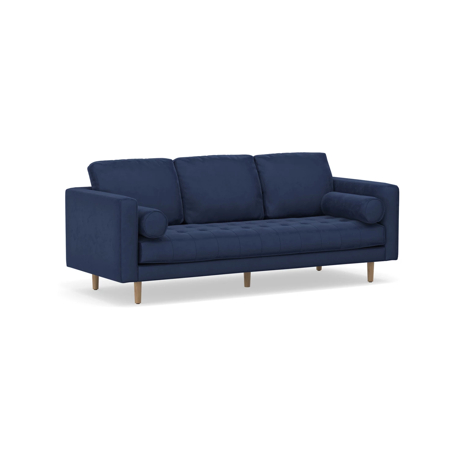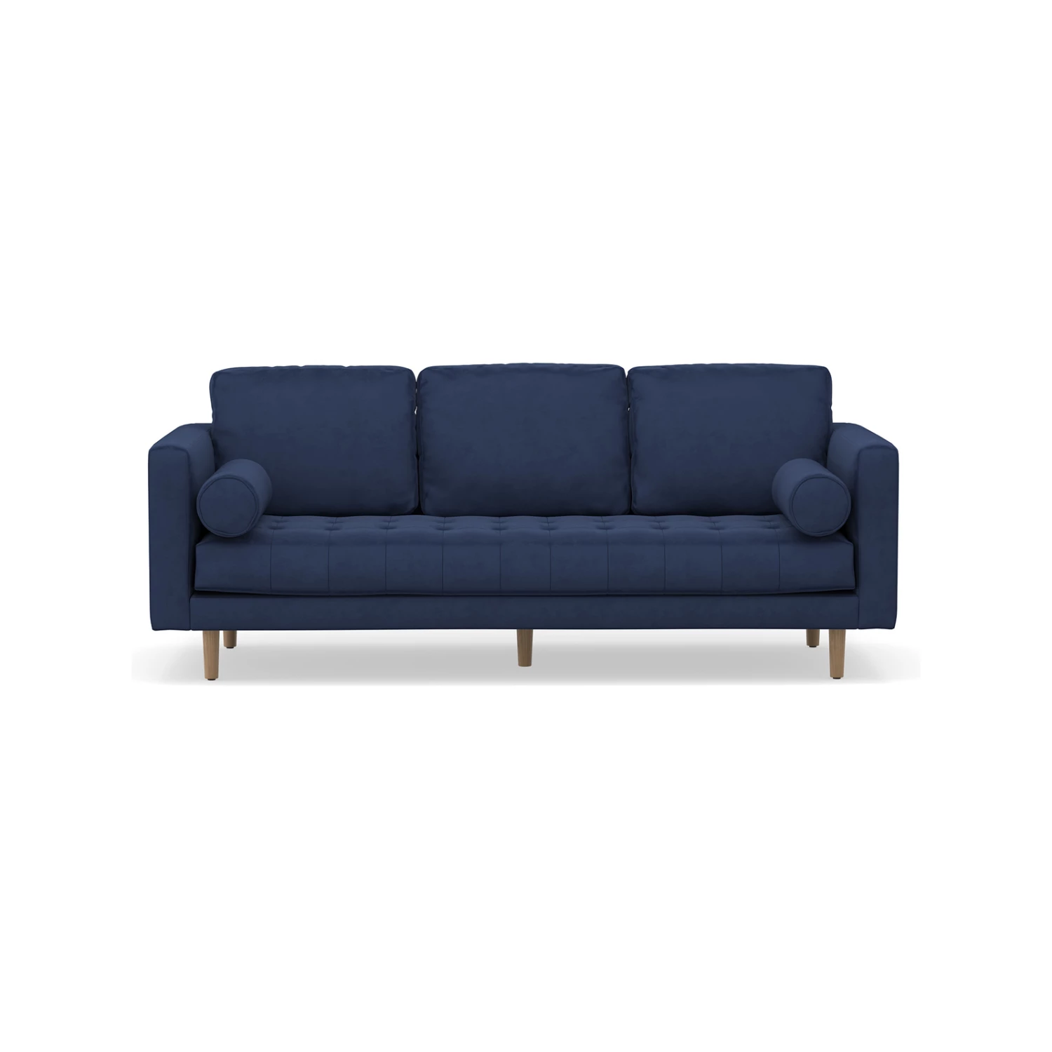 Exuding Danish mid-century glamour with a modern twist, the Kirra sofa brings understated luxury and elevated living. Enveloped in a gorgeous deep indigo blue velvet with classic biscuit tufting details, round end bolsters and tapered natural timber legs, Kirra is a stunning work of art reminiscent of the classic designs of its time.