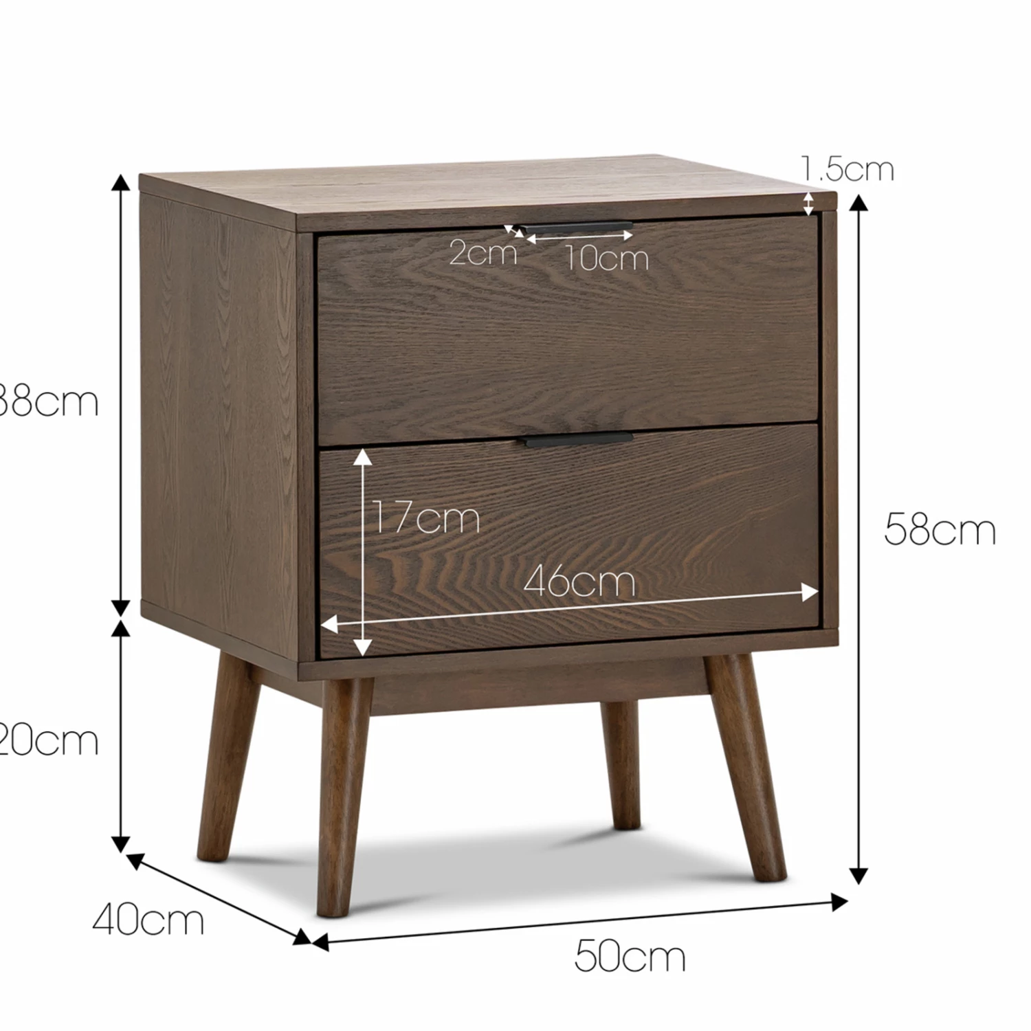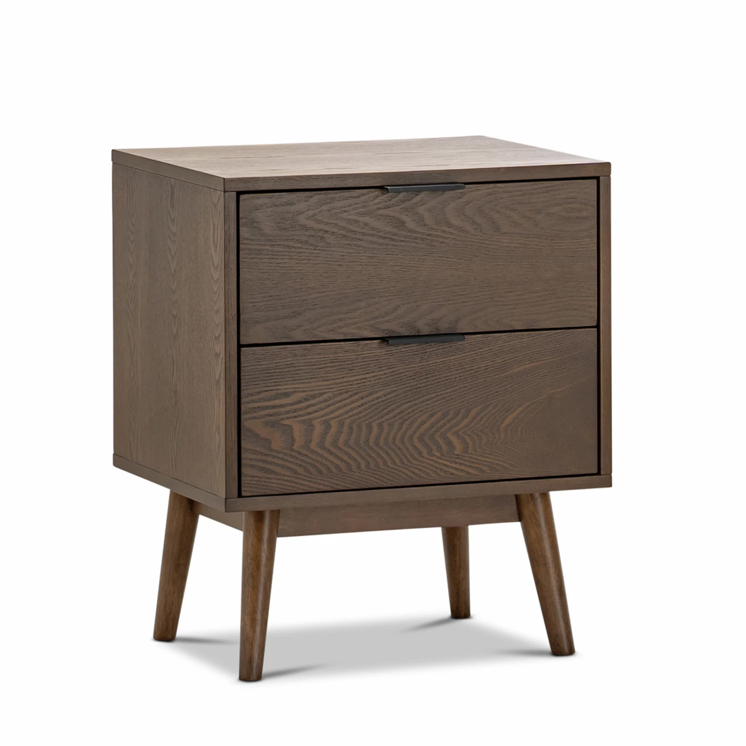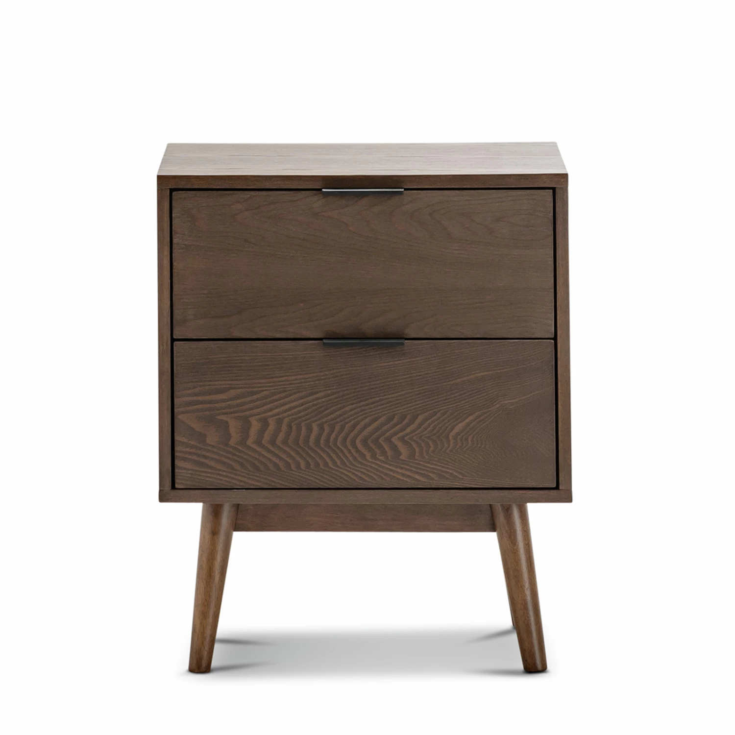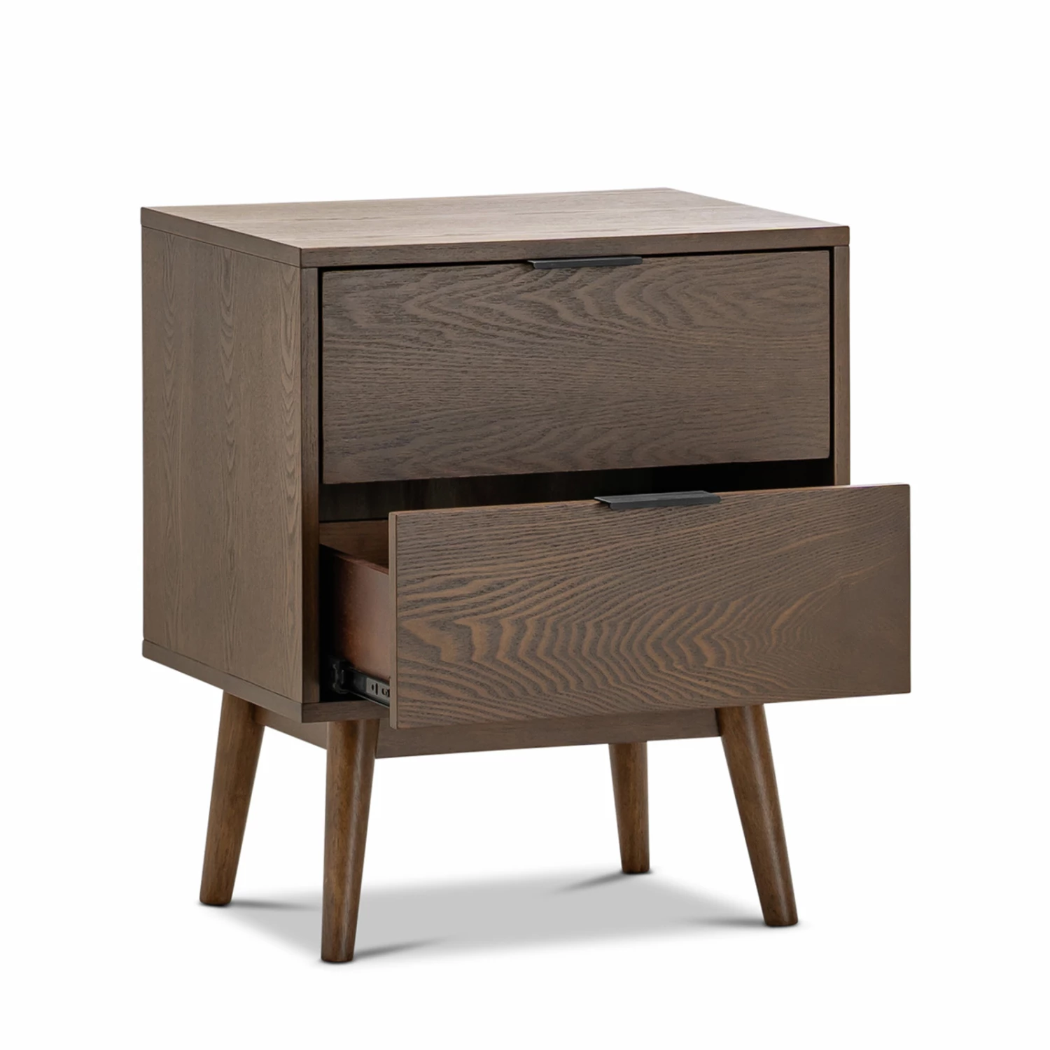 As they say design must seduce, shape and evoke an emotional response. That sentiment is built throughout the Stella 2 Drawer beside table. It accentuates Mid Century Modern Sophistication with Scandinavian minimalism. Dressed in an all-natural American Walnut veneer, flaunting a set of long timber legs, paired with sleek matte black handles for a touch of contrast. Highlighting its organic wooden grains and tones as intended by mother nature. Calling out just enough attention to itself, it’s ready to be paired up with its bedroom counterparts.
