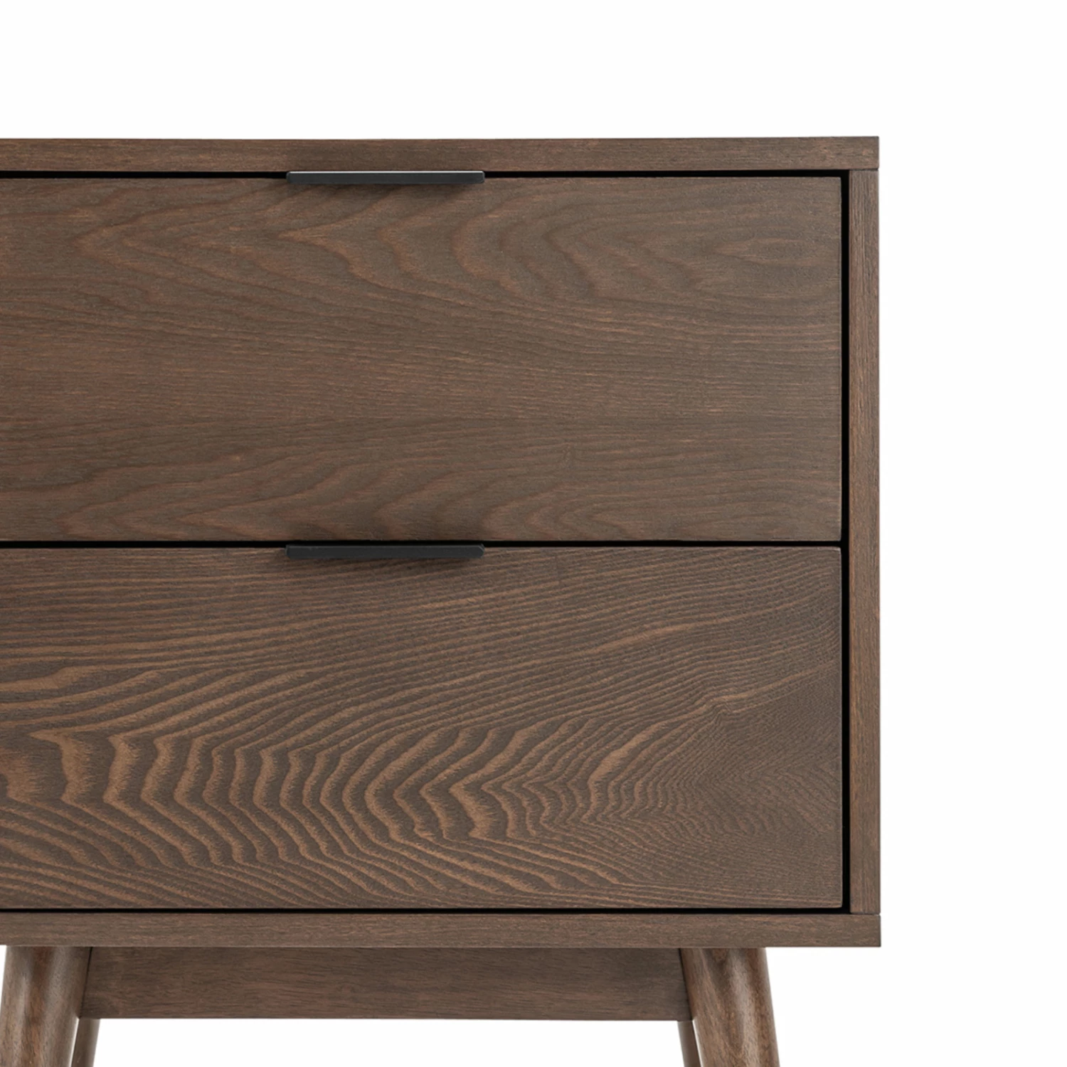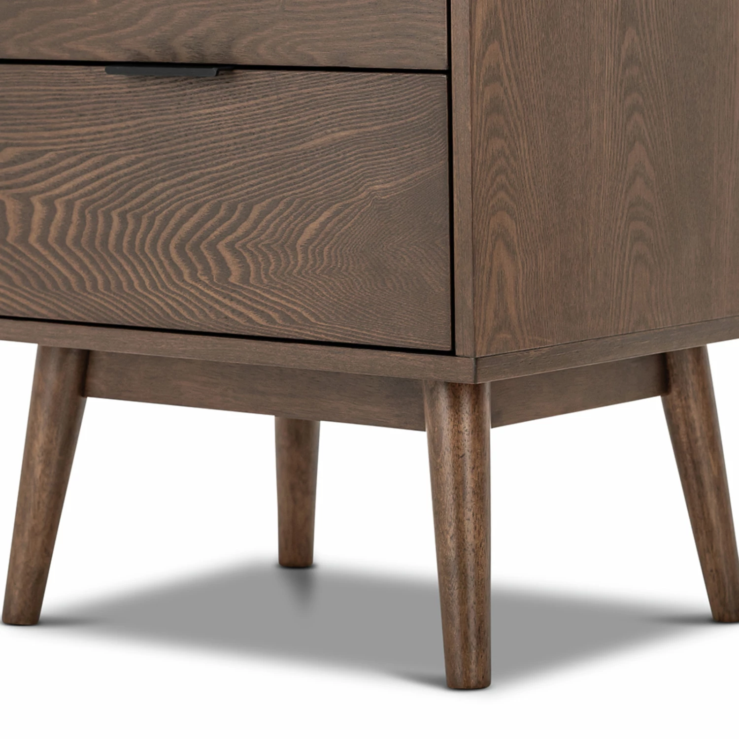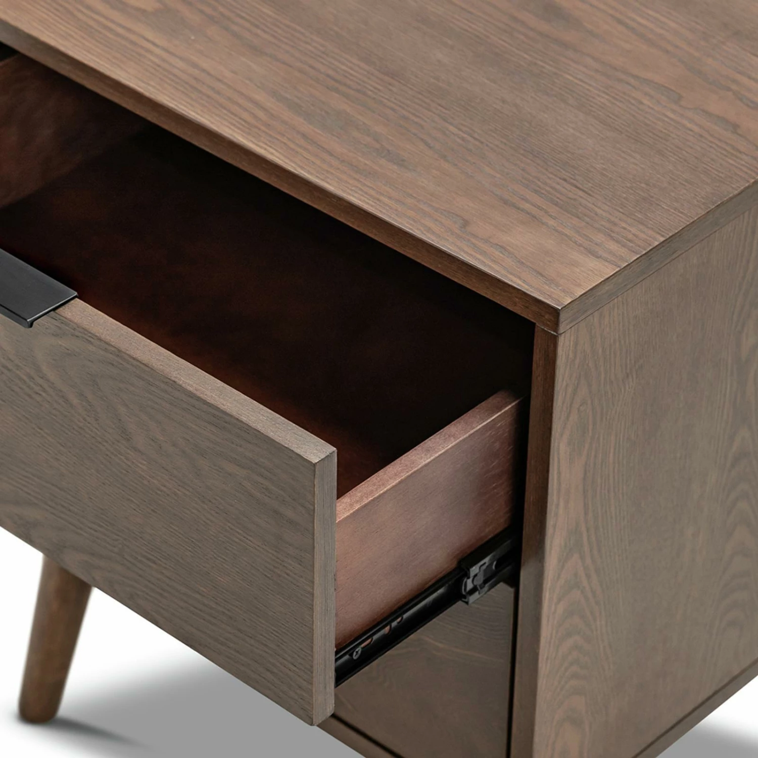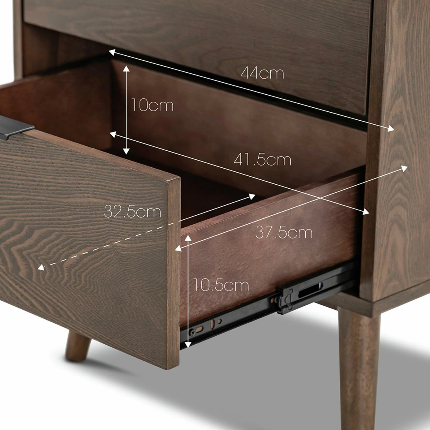 As they say design must seduce, shape and evoke an emotional response. That sentiment is built throughout the Stella 2 Drawer beside table. It accentuates Mid Century Modern Sophistication with Scandinavian minimalism. Dressed in an all-natural American Walnut veneer, flaunting a set of long timber legs, paired with sleek matte black handles for a touch of contrast. Highlighting its organic wooden grains and tones as intended by mother nature. Calling out just enough attention to itself, it’s ready to be paired up with its bedroom counterparts.