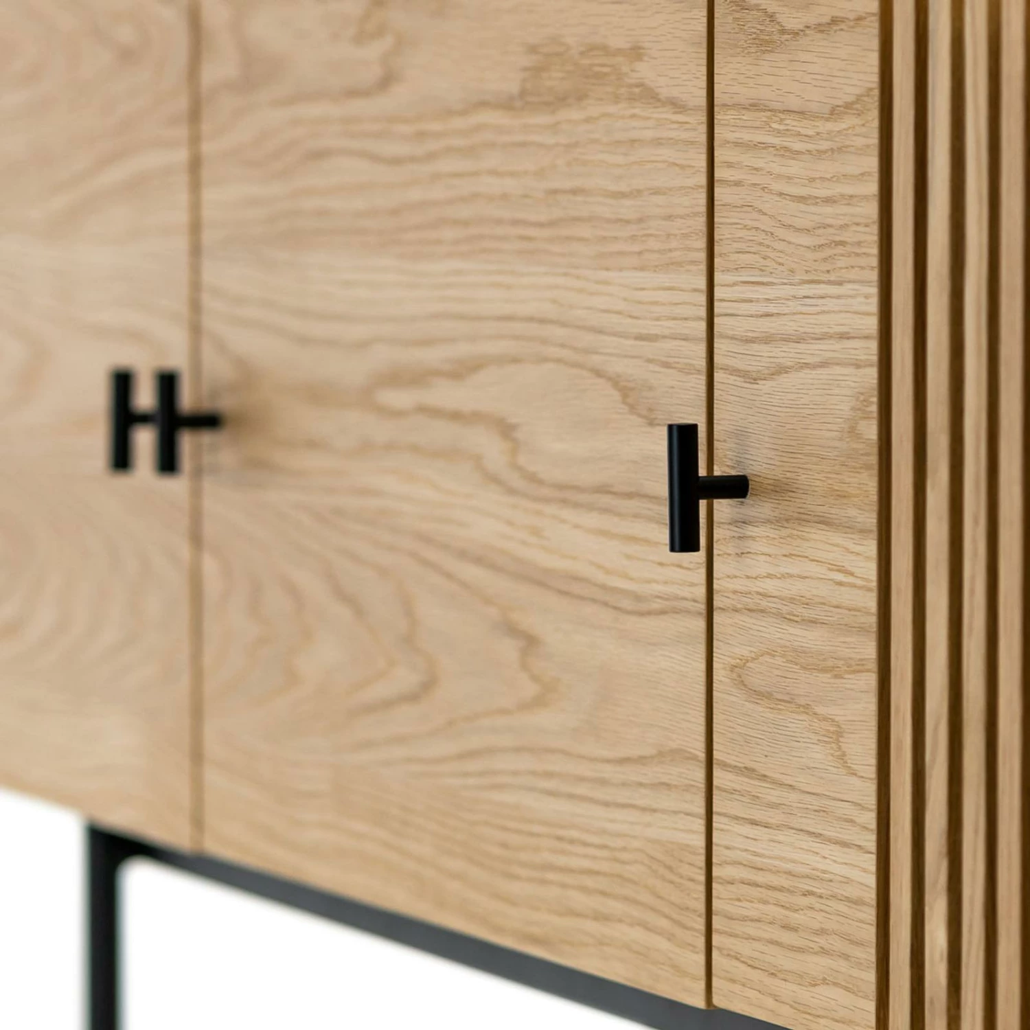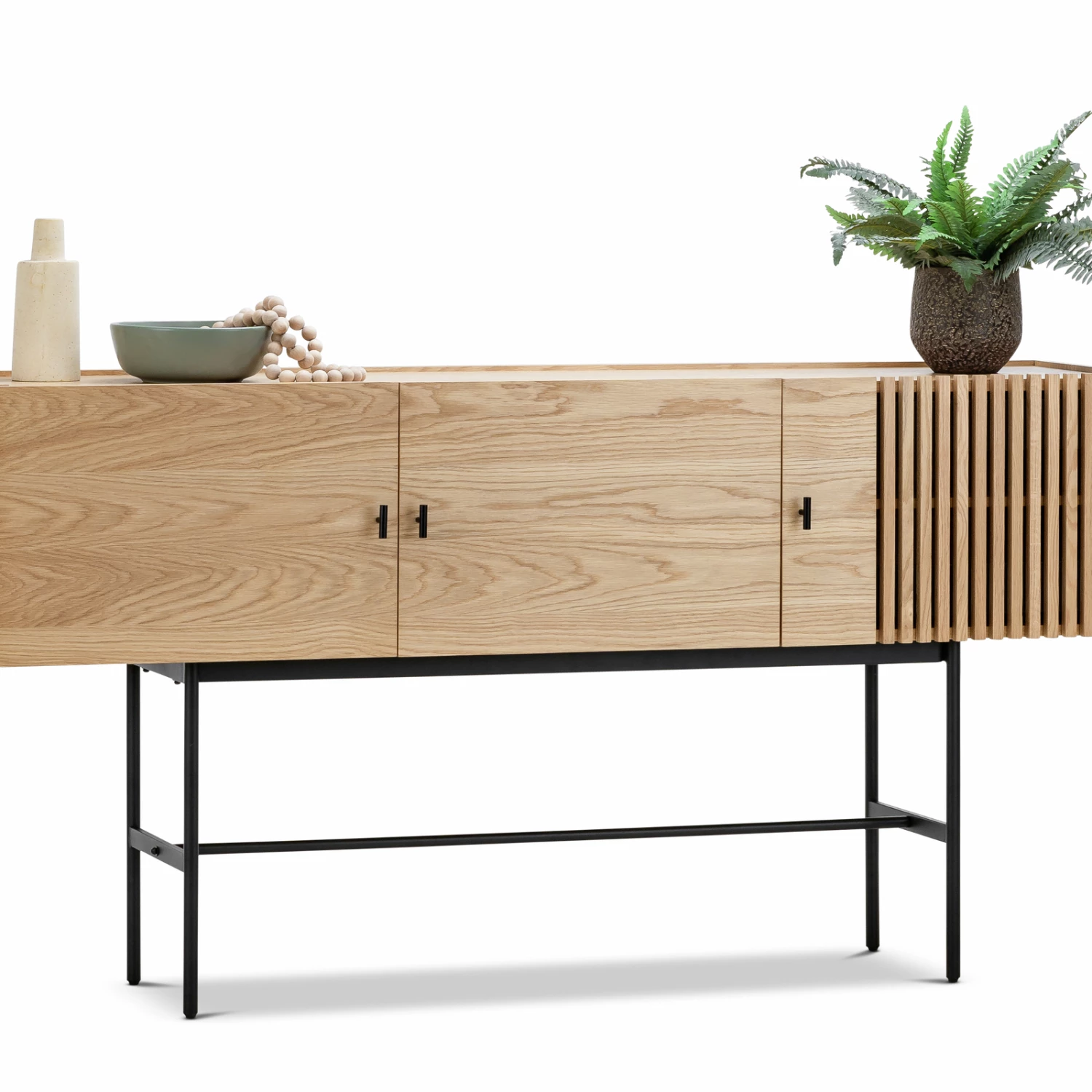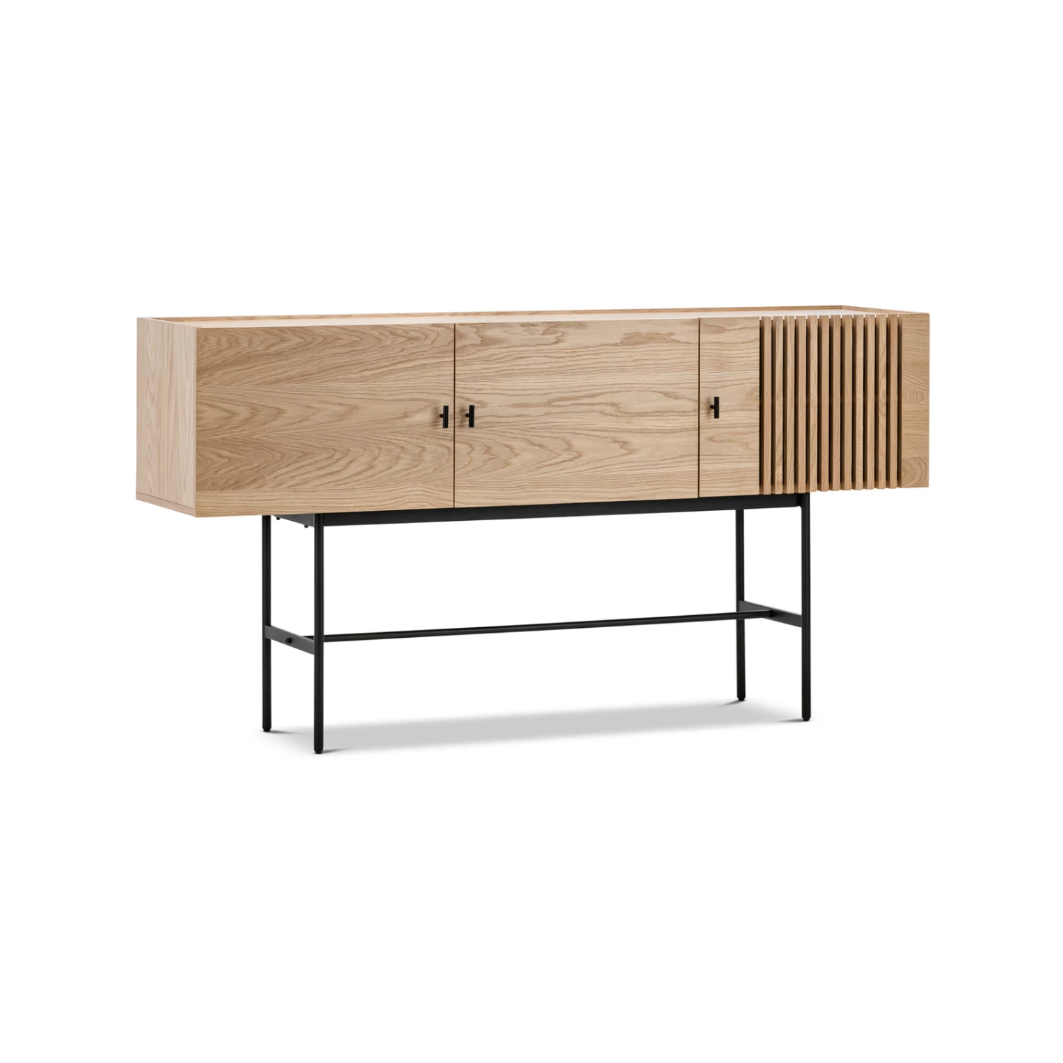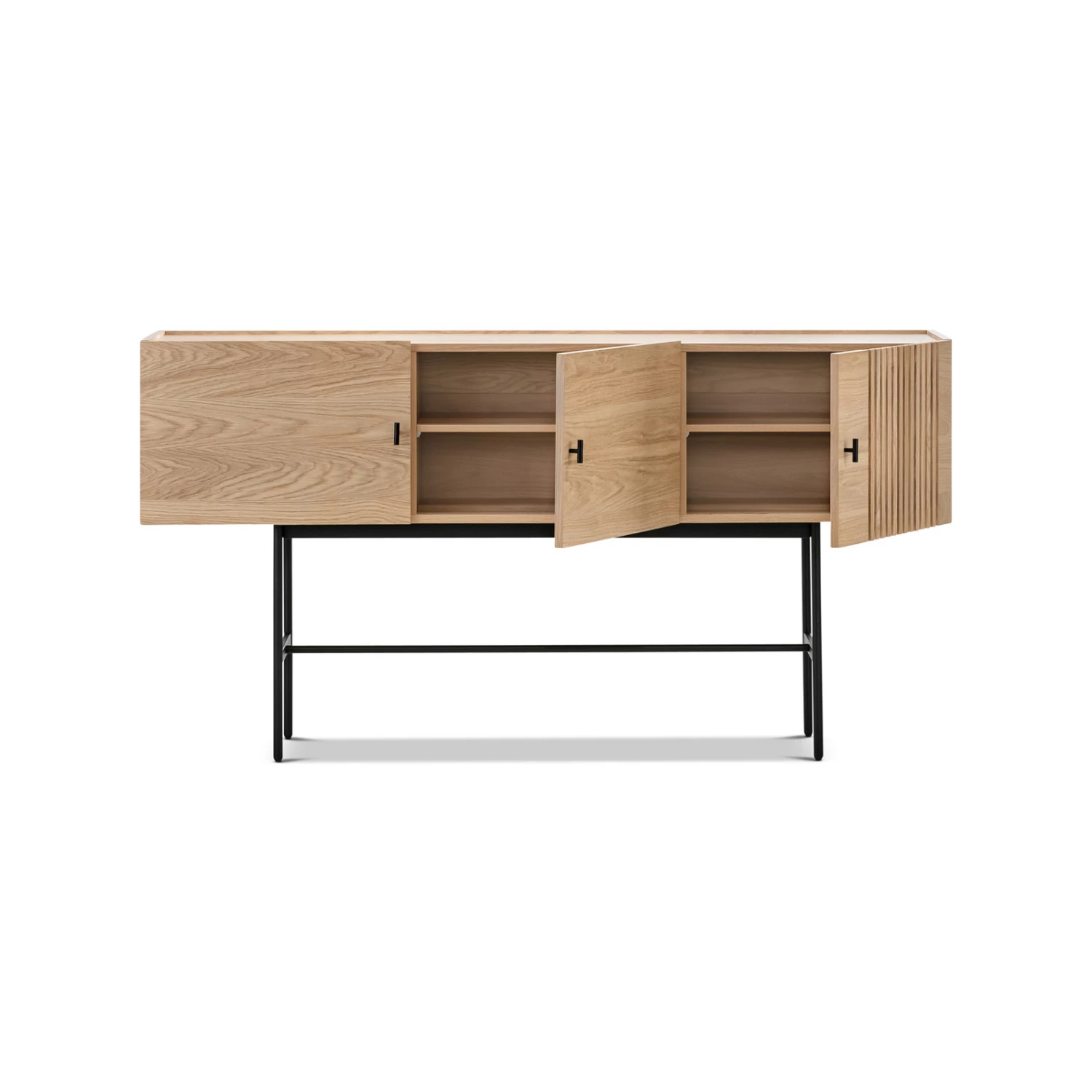 The Xaviar series presents beautiful modern geometric shapes with hints of simple sophistication. The Xaviar Array Sideboard was inspired by the wood slate cladding of modern architecture. The Vertical lines allow for a visual movement from top to bottom. The asymmetrical pattern adds a measure of depth to its organic Natural Oak Wood while hiding storage practically in plain sight. The slate doors create an illusion of transparency, peaking the user’s curiosity as to what is hidden behind closed doors. Sitting on slender black metal frame legs, suspending the sideboard at just the right level for easy reach when putting things away. Who knew functionality and aesthetics could be paired so well together.