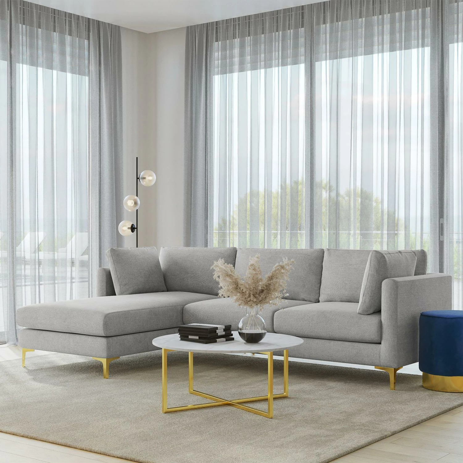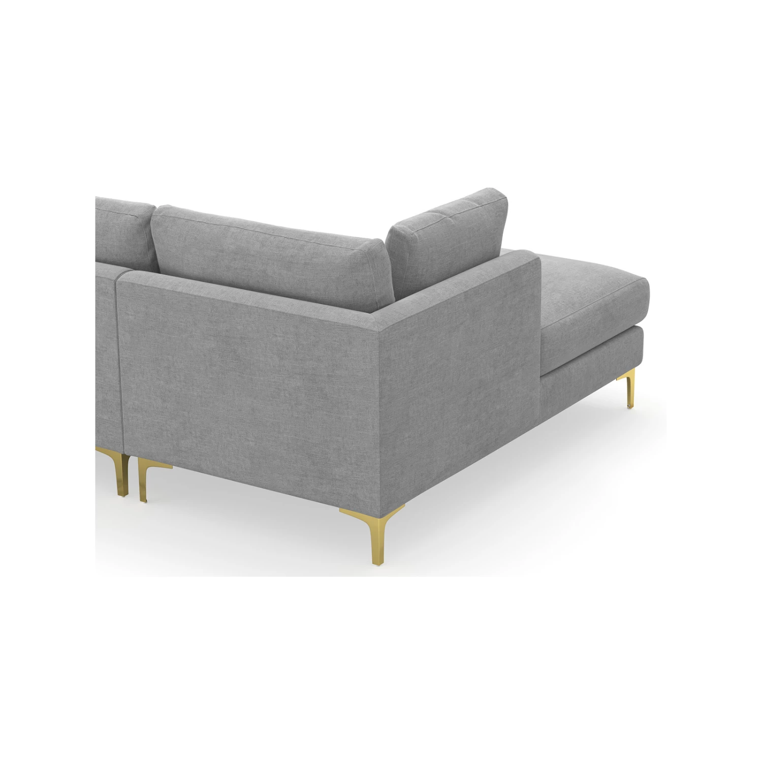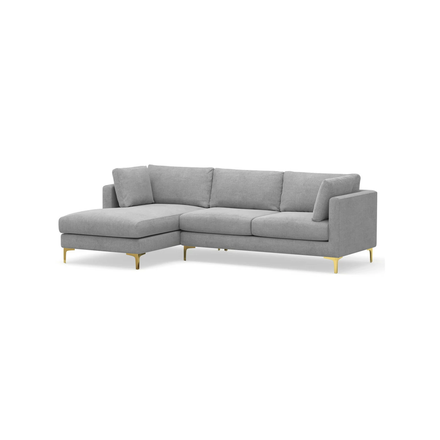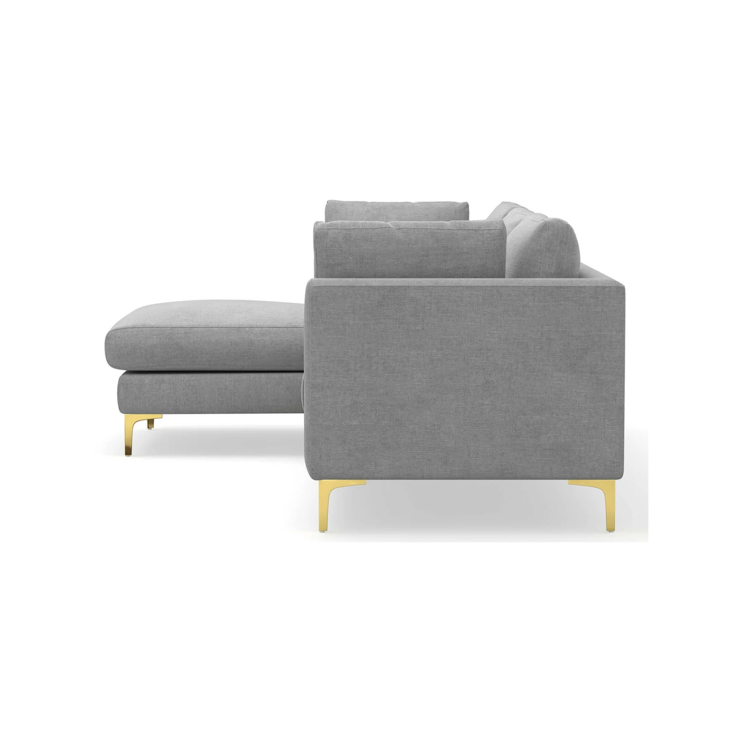 Channel art deco glamour with the Alex 3.5 Seater Sectional Sofa with Chaise Lounge. Featuring beautiful reflective gold legs, a neat structured design and a generous chaise in left or right options, Alex is subtly glamorous with its mid grey fabrication and side cushions for all round comfort. The perfect modern take on luxe interiors.
