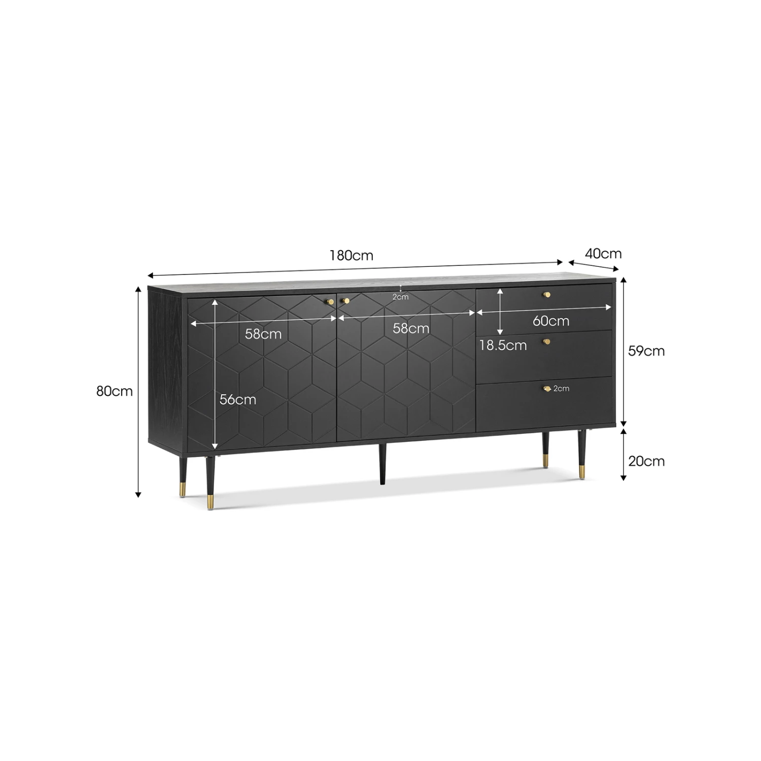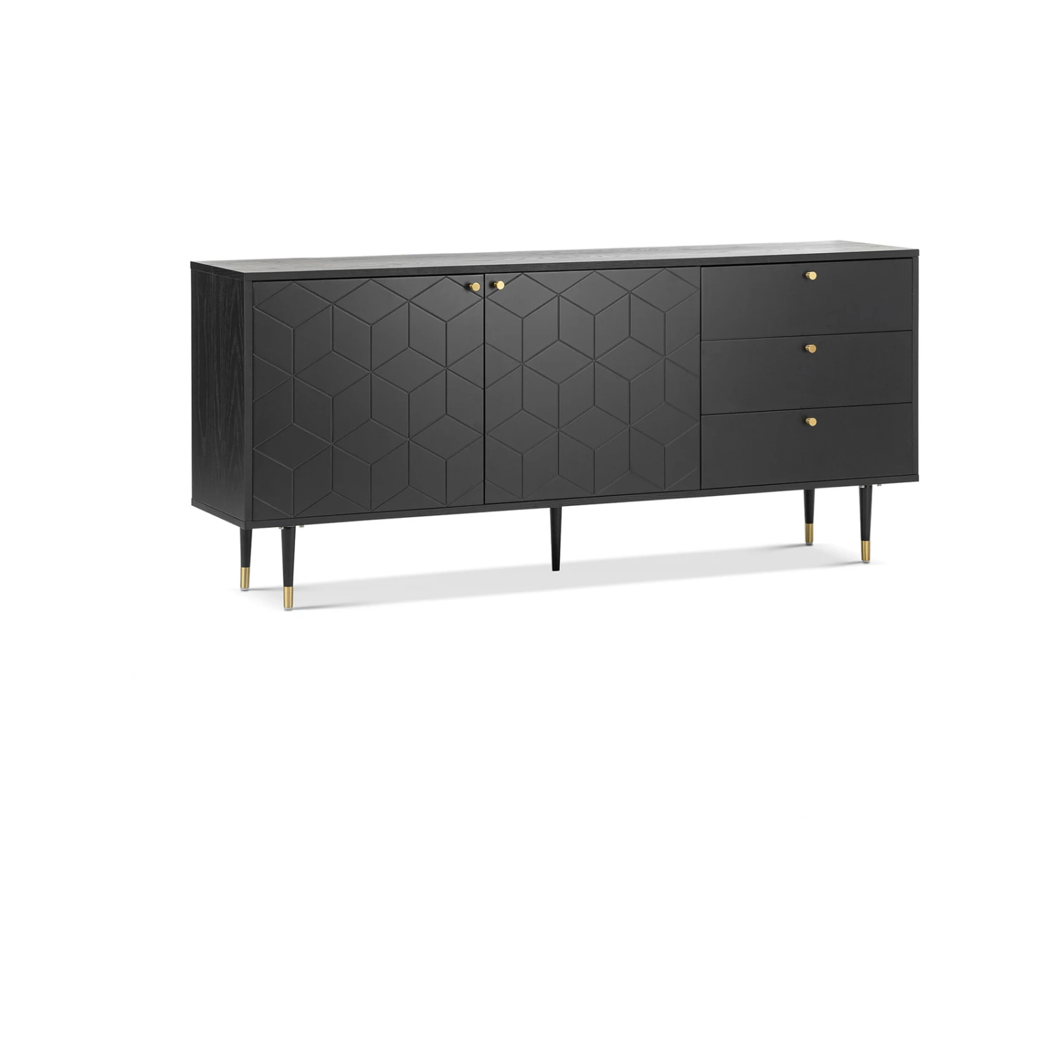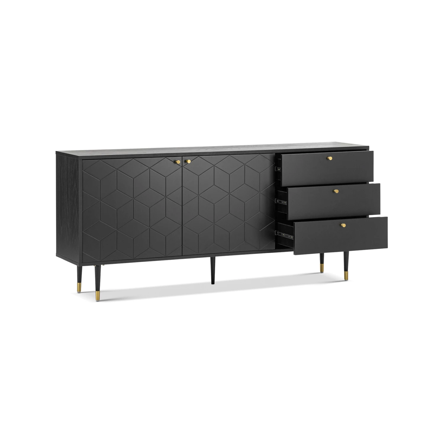 We believe storage should never be boring. The Hexii Oak Sideboard is testament to our belief. Take for example the precision etched Hexagonal patterned door that brings style and tactility into its looks. Its dual finish with a touch of gold demonstrates that luxury can be achieved through simplicity, accentuated by its Mid-Century Luxe styling. Simplicity in ergonomic drawers and 2 large doors ensure maximized storage, a simple pull or push away with its sophisticated Brushed Gold Knob Handles. Whether in the living or dining room areas, the sideboard works both as a standalone or paired storage unit you will love to love.
