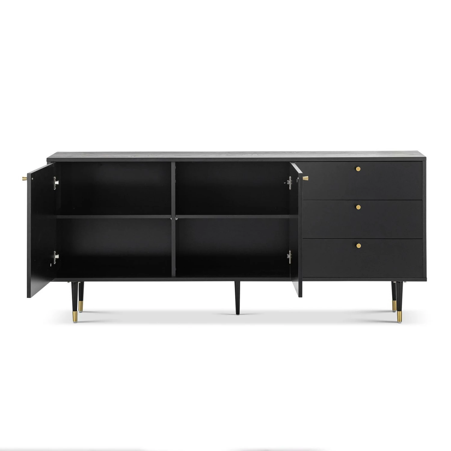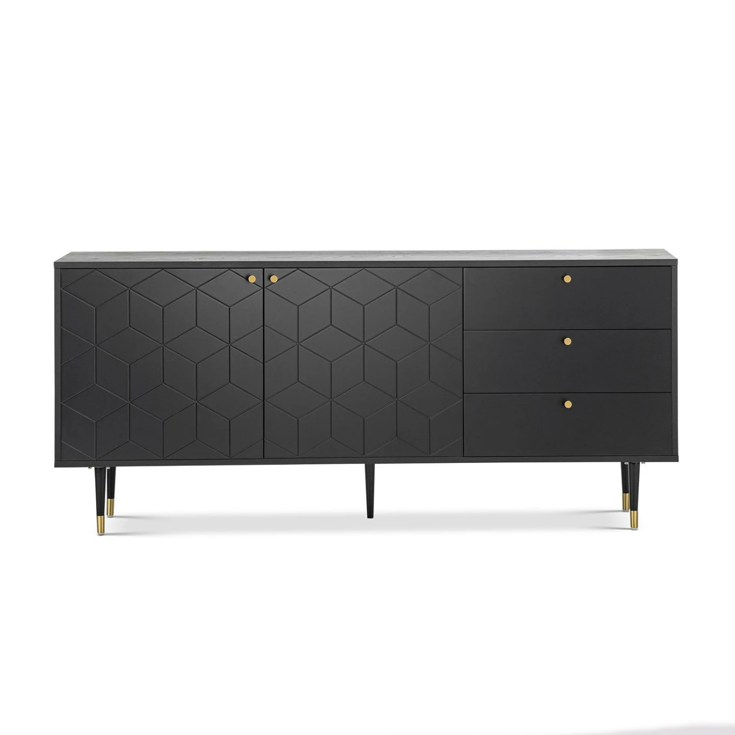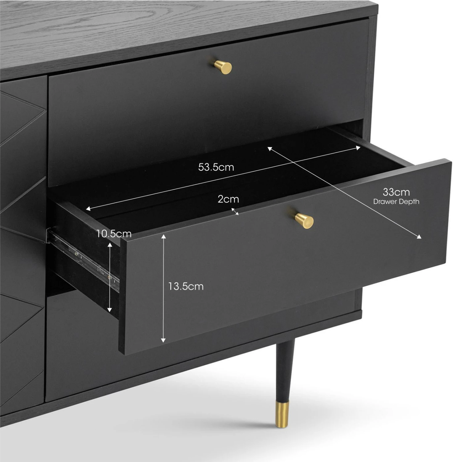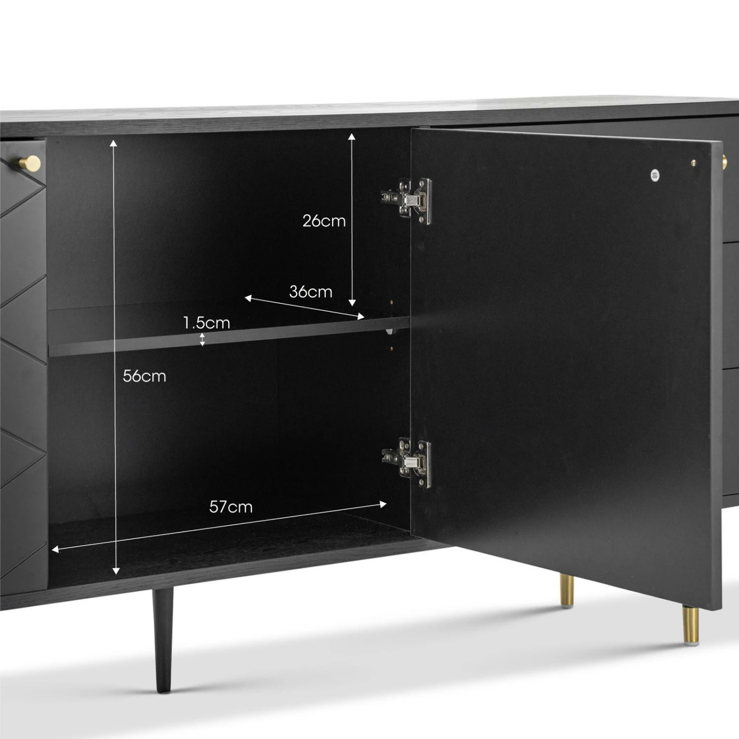 We believe storage should never be boring. The Hexii Oak Sideboard is testament to our belief. Take for example the precision etched Hexagonal patterned door that brings style and tactility into its looks. Its dual finish with a touch of gold demonstrates that luxury can be achieved through simplicity, accentuated by its Mid-Century Luxe styling. Simplicity in ergonomic drawers and 2 large doors ensure maximized storage, a simple pull or push away with its sophisticated Brushed Gold Knob Handles. Whether in the living or dining room areas, the sideboard works both as a standalone or paired storage unit you will love to love.