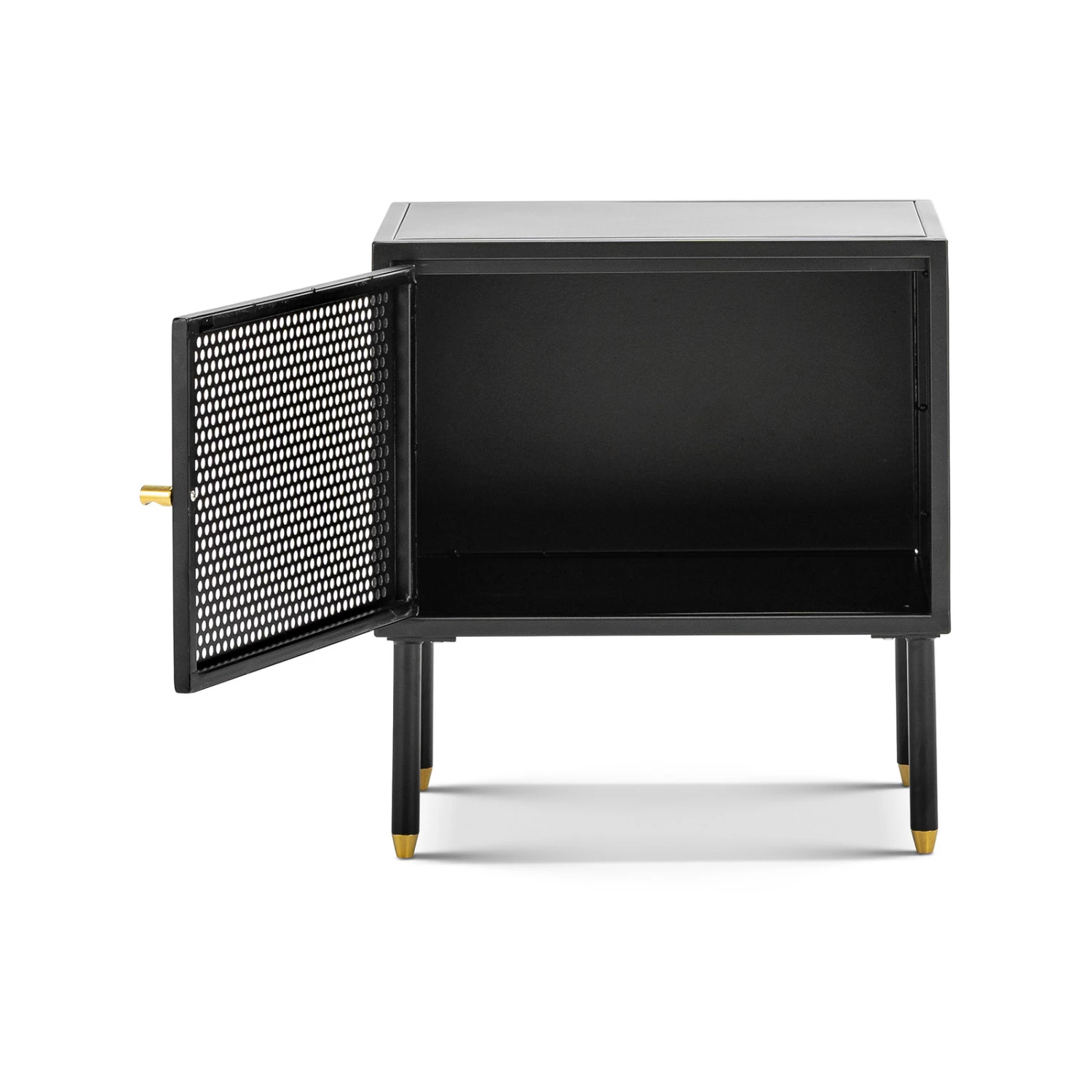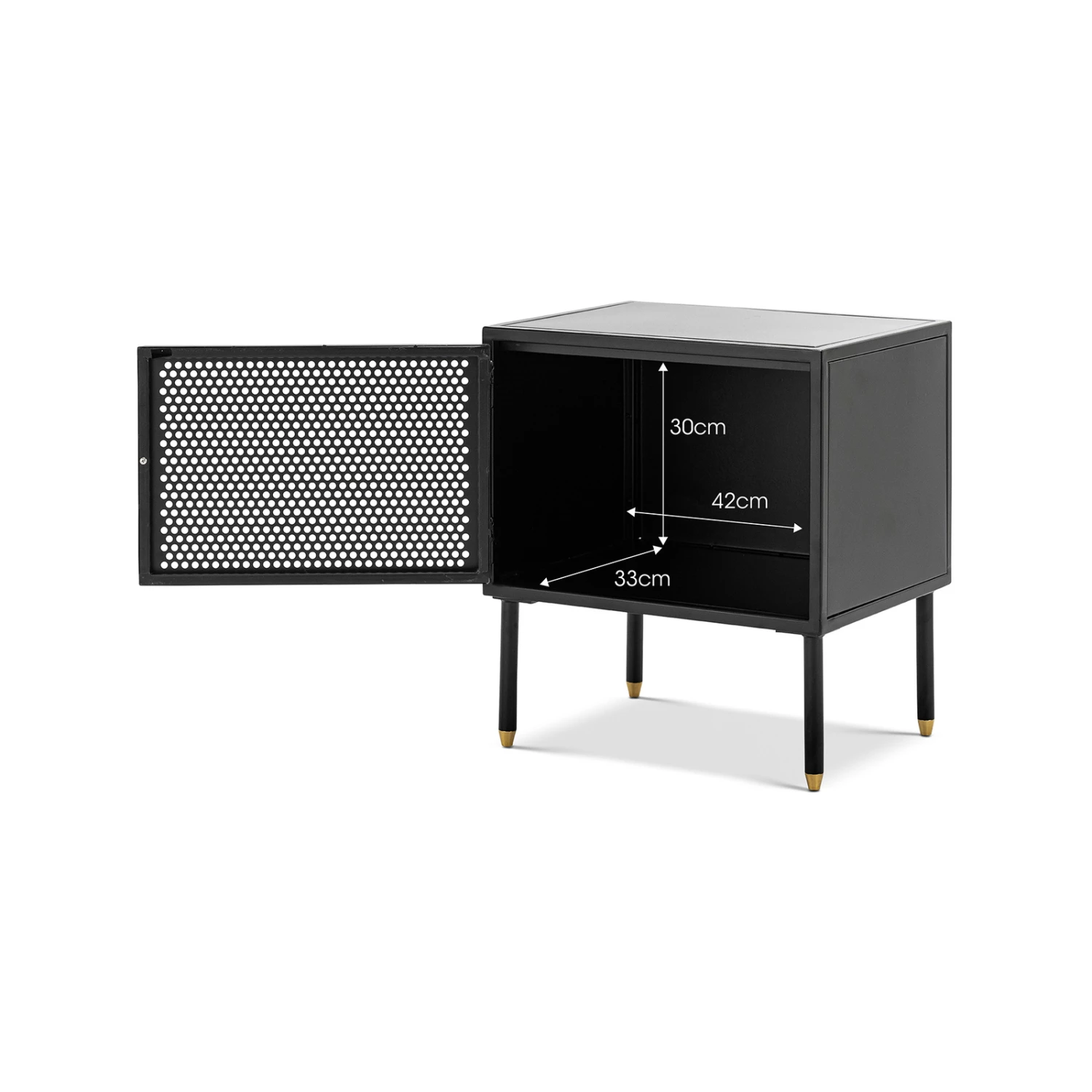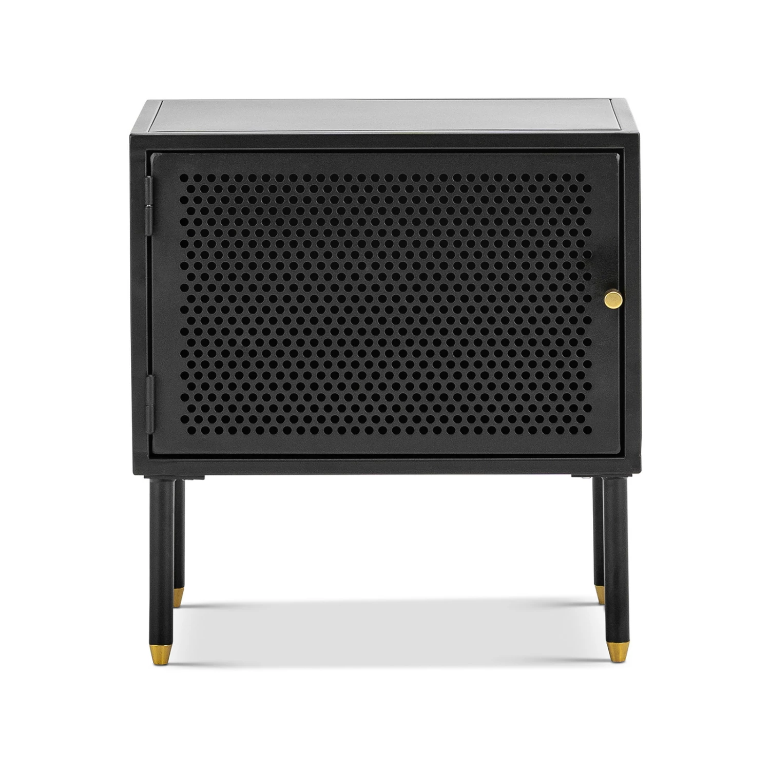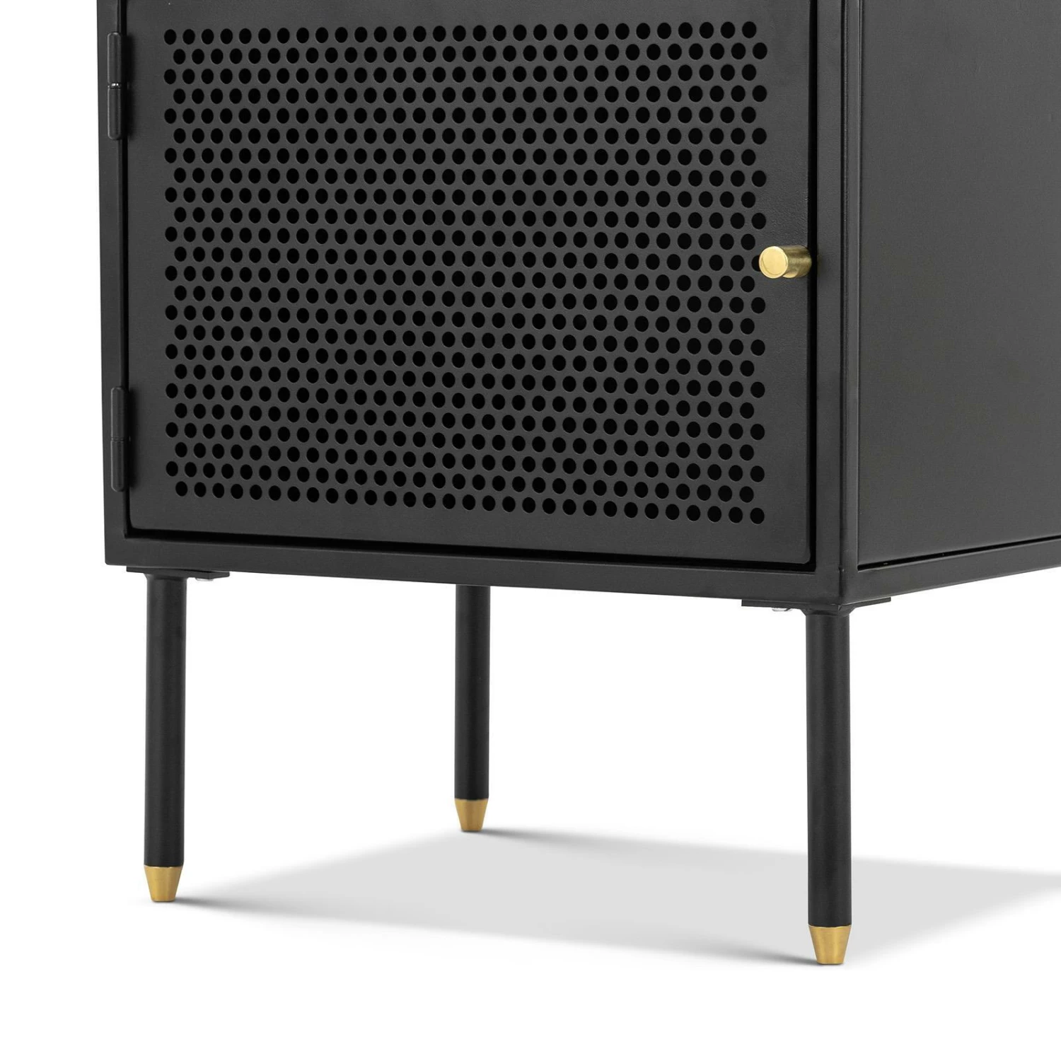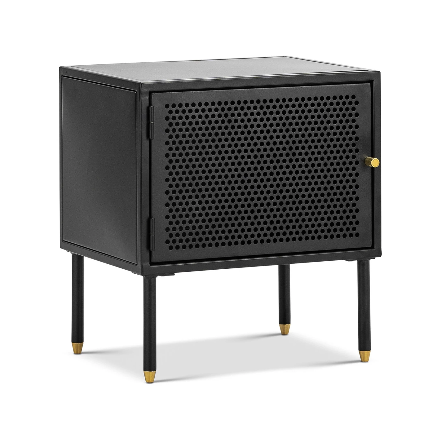 The Mesh collection draws inspiration from the Modernist movement, each piece aims to evoke a graphic and sculptural impression. The Mesh 1 Door Side Table explores the relationship between simplicity and functionality. A simple storage solution with a contemporary design. The all body steel construction with powder coated finish offers an open shelf and perforated detailing and brass accents. Its perforated doors allow light to subtly travel through whilst giving a glimpse of the objects that are stored behind. The Mesh Side Table is a minimalistic yet spacious piece.