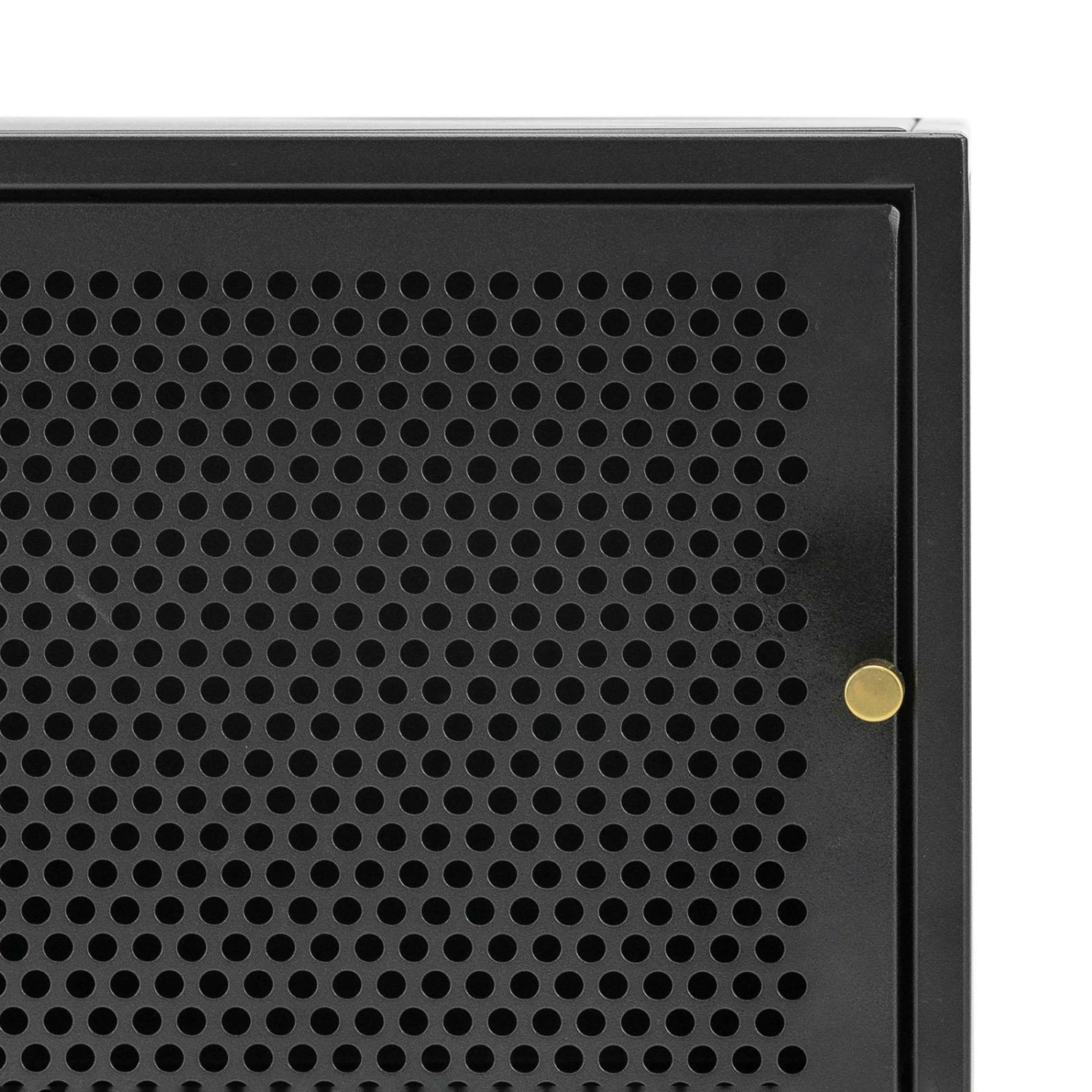 - Transparent perforated steel doors with brass accents